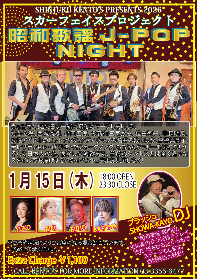 | 22(月) | ★昭和歌謡 J-POP NIGHT★SCAR FACE PROJECT ユウコ&カスミ&メイ&ヒナ&カズマ Extra Charge¥1,650 |
